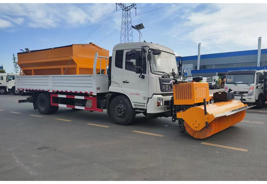 上裝配置 整體避障除雪鏟,夜間工作燈,車取力重型除雪鏟(左右雙液壓驅動)可搭配8立方或者10立方融雪撒布機(獨立柴油動力,鏈條刮板輸送,采用V型料倉,頂部帶防雨罩,折疊式不銹鋼撒布盤)3-3.5米雪鏟、3-3.5米雪鏟及撒布機均采用集成按鍵駕駛室操作。