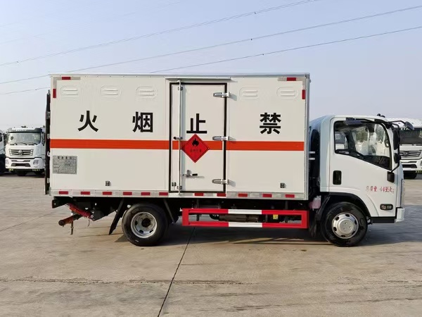 貨箱配置 廂體為雙層金屬骨架結構,外板采用冷軋鋼板,中間填充阻燃泡沫,內飾為鋁板。底板為平板上鋪防靜電膠皮。廂內兩側加裝固定貨物臥環,門框帶防盜報警器,頂部帶煙霧報警器,廂體右側選裝側門,隨車配2個滅火器,危險標志牌,防火帽,危險品三角頂燈。(選裝瓦楞板貨箱) (尾部可選裝液壓升降尾板)